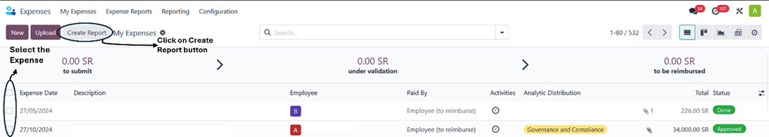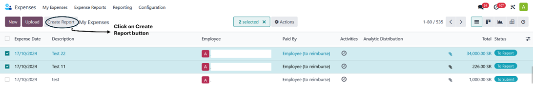 Back to the main page of the module by clicking on My Expenses and select the expenses you want to then click on the “Create Report” button to submit for approval.