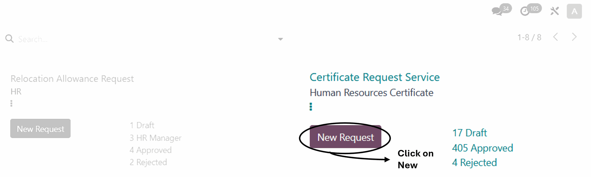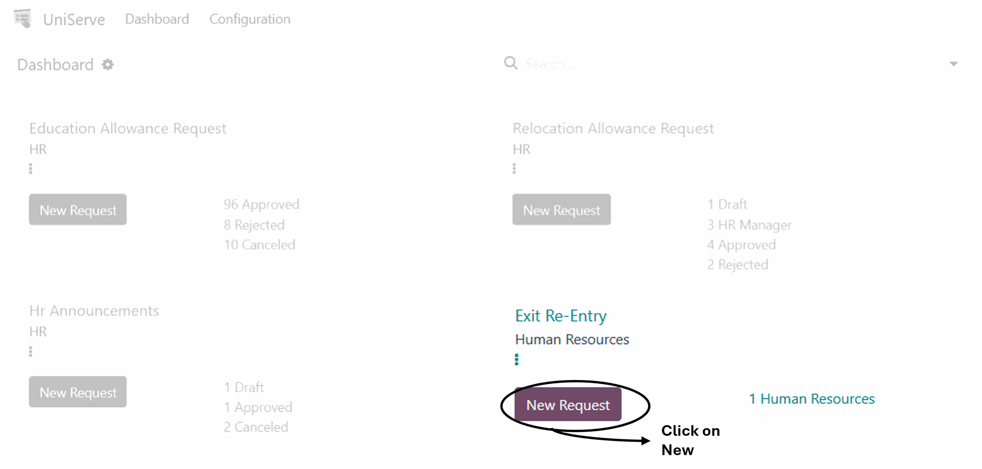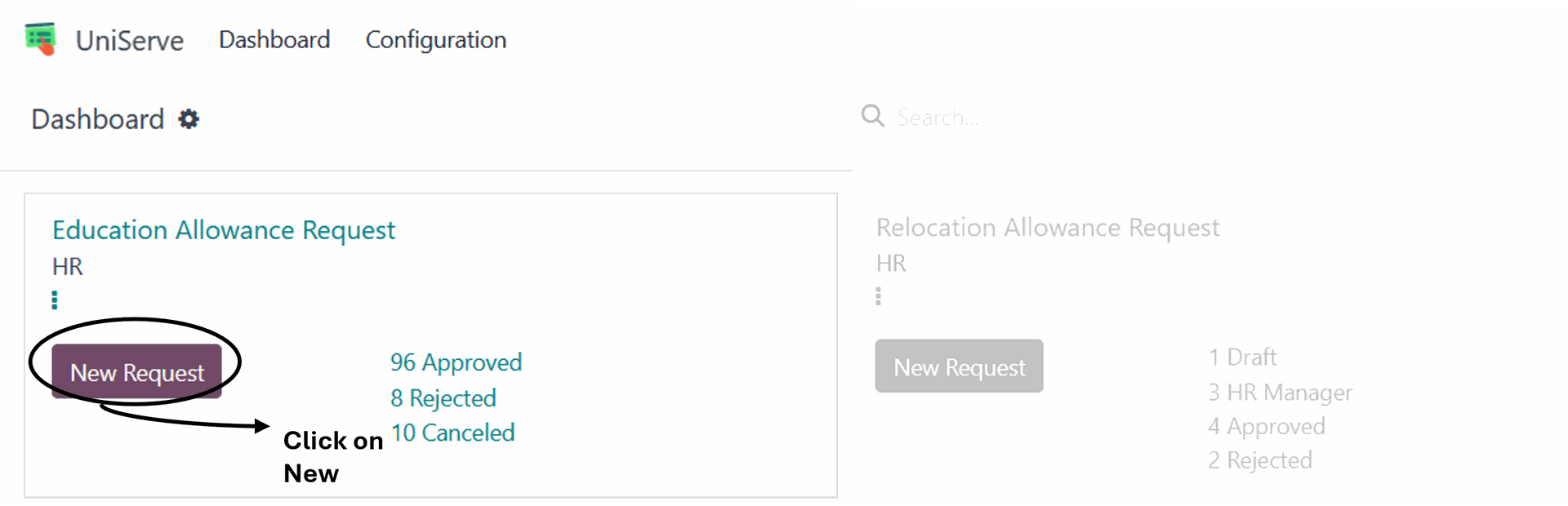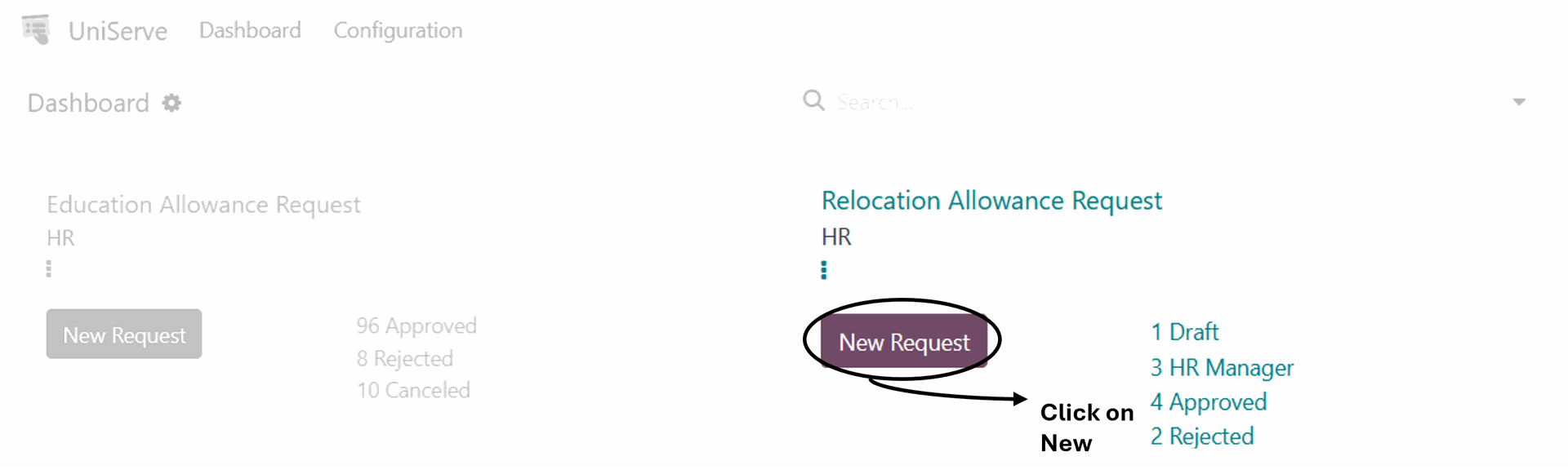 Click on the "New Request" for Relocation Allowance on the dashboard page