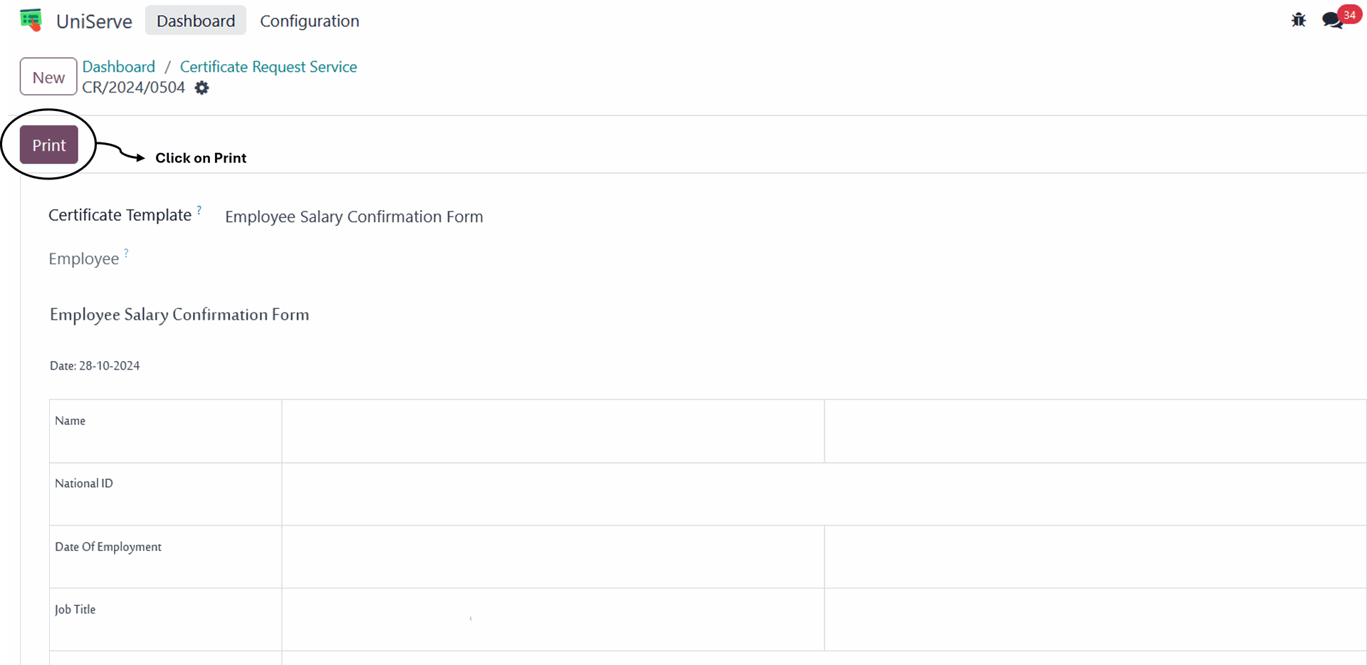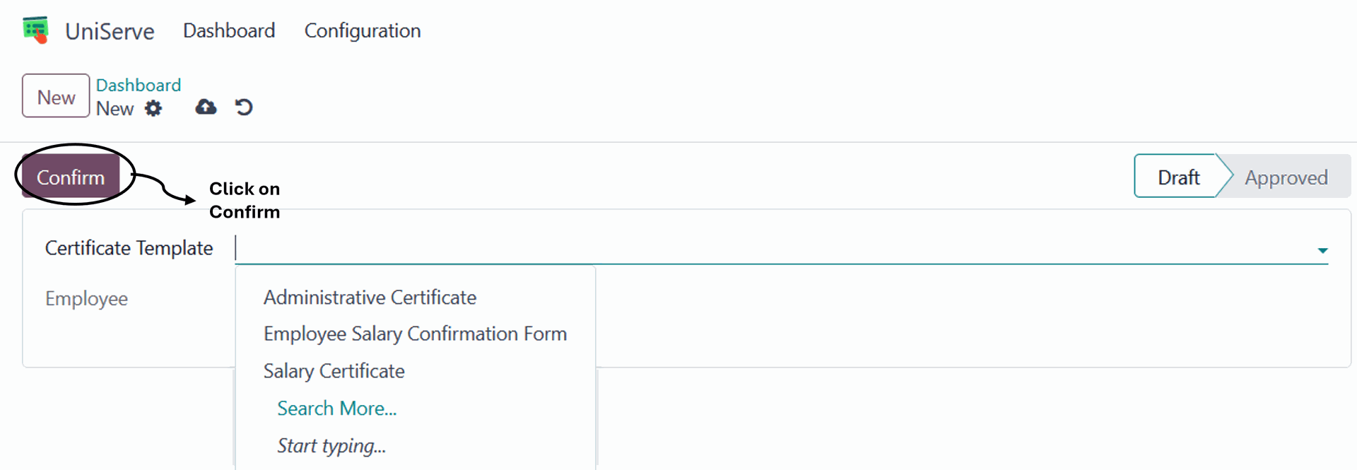When accessing the request page. The employee fills in the required field "Certificate Template"then click on confirm