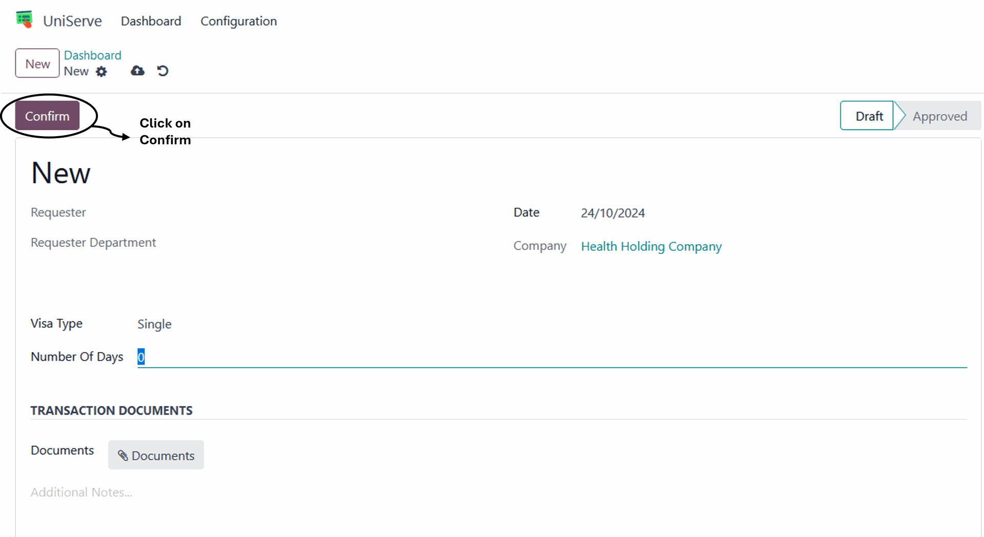 When accessing the request page, the requester and department's requester will appears automatically. The employee should fills in the required fields "Date, Visa type, Number of Days, transaction documents"and then clicks on Submit