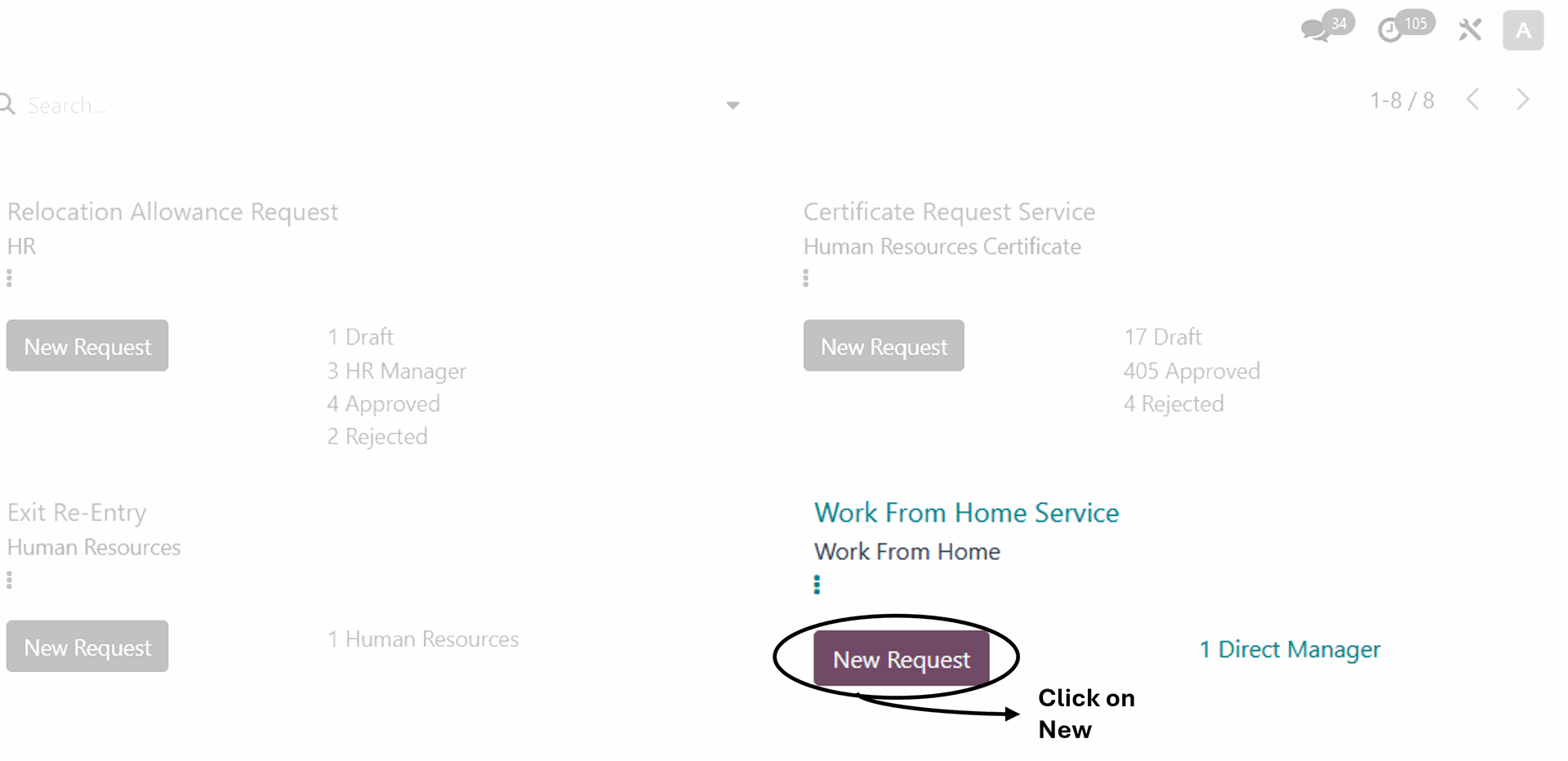 Click on the "New Request" for Work From Home Service on the dashboard page. Only the managers can submit a request for the employees under their supervision.