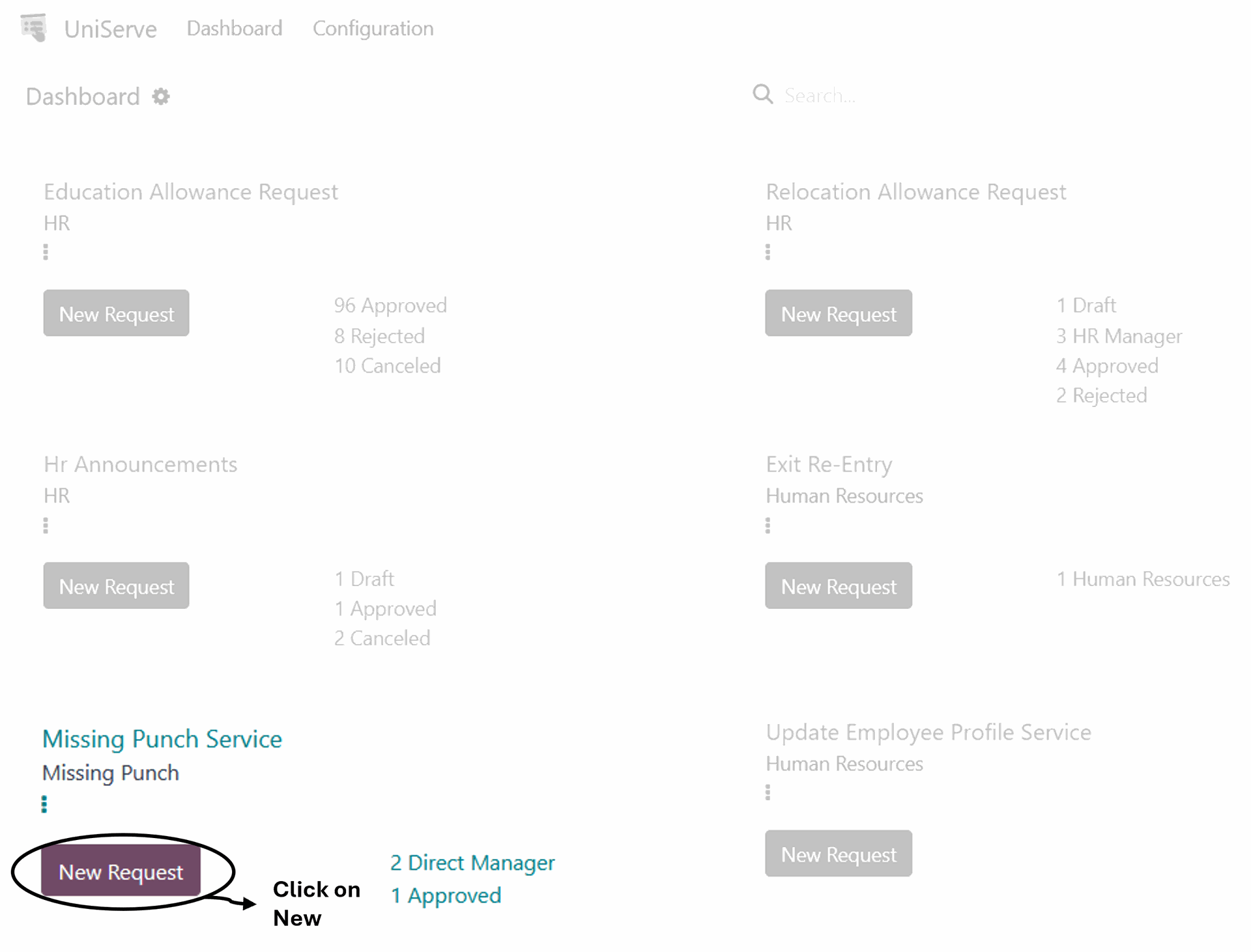 Click on the "New Request" for Missing Punch Service on the dashboard page. Only the managers can submit a request for the employees under their supervision to modify the missing punch