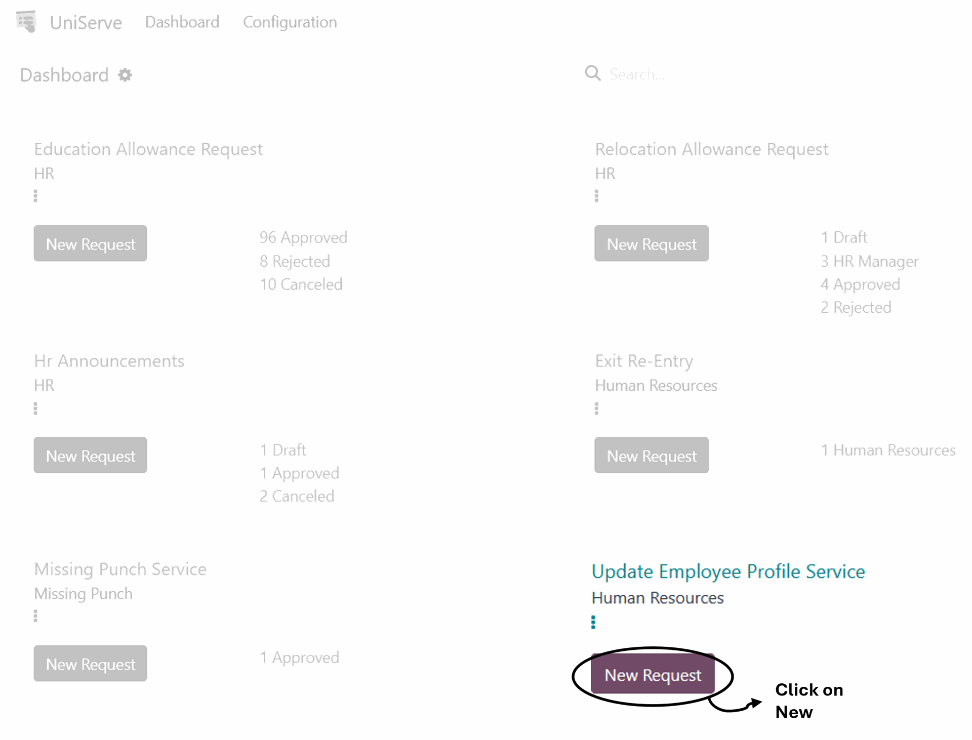 Click on the "New Request" for Update Employee Profile Service on the dashboard page.