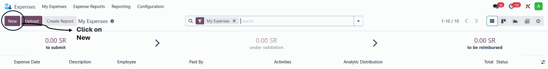 The page below will appear. You can return to the module list page by clicking on the top left icon highlighted in the red box or you can create an Expenses request by clicking on "New"