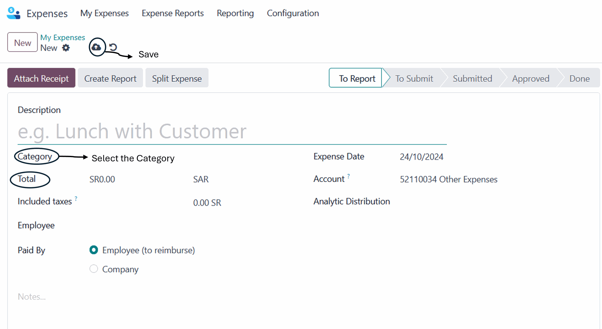 Then fills in all their required fields, including description, category, and total amount, and selects whether the expenses were paid by the employee or the company. After that, they click on "Save." After saving the expense request you can attach a receipt then create report