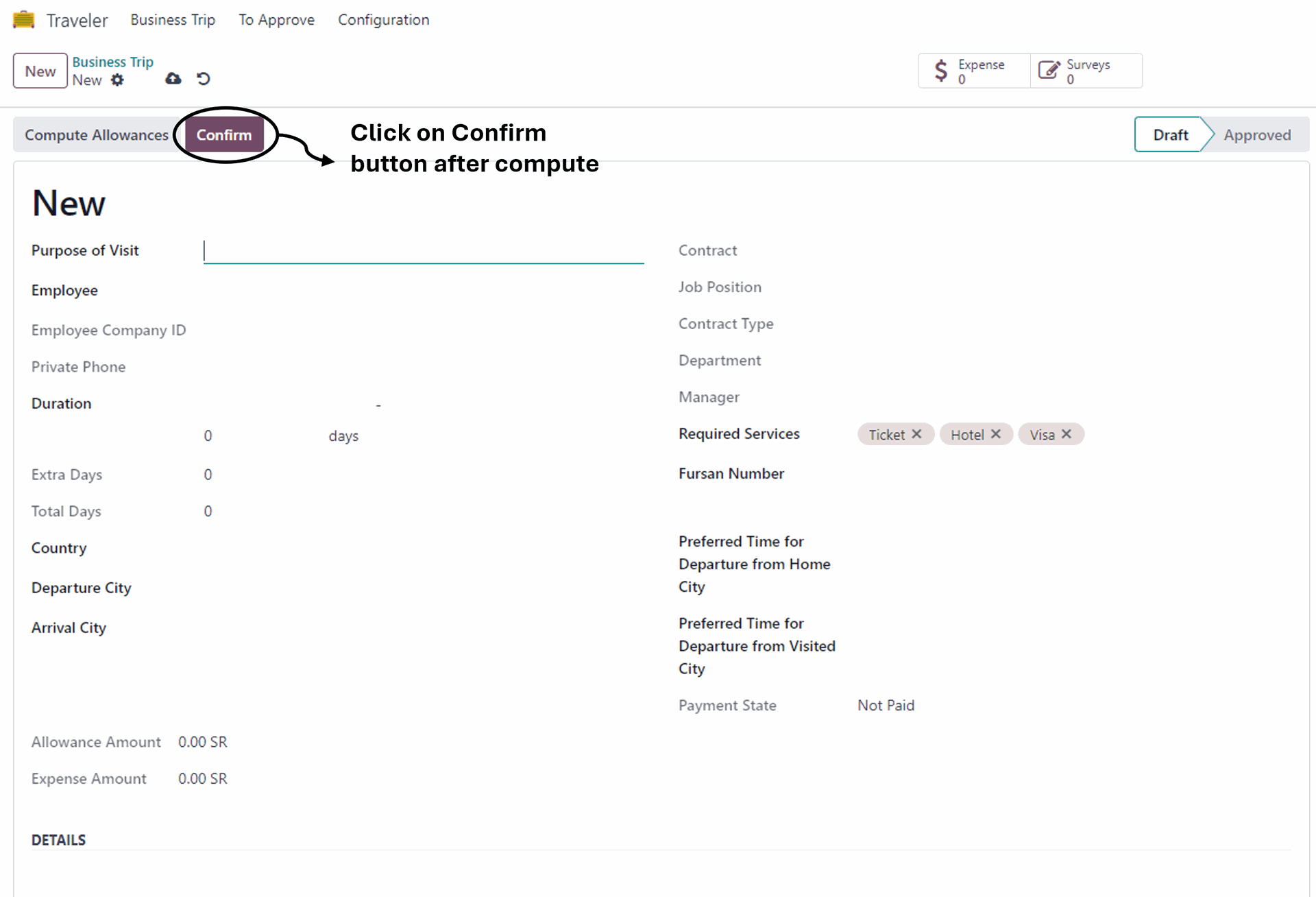 When clicking on save the allowances will be calculated based on the employee's choices. Then, click the confirm button if all the information is accurate. The request will go through several approvals