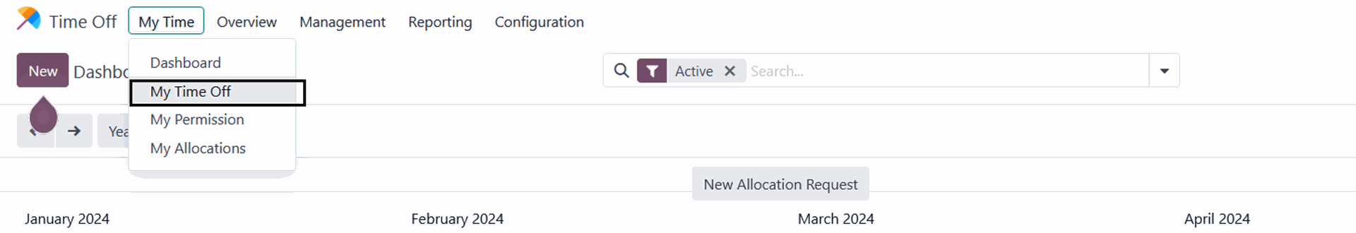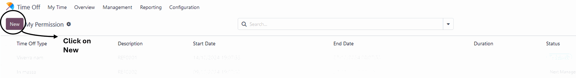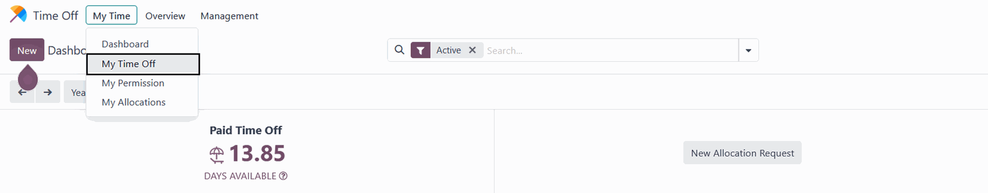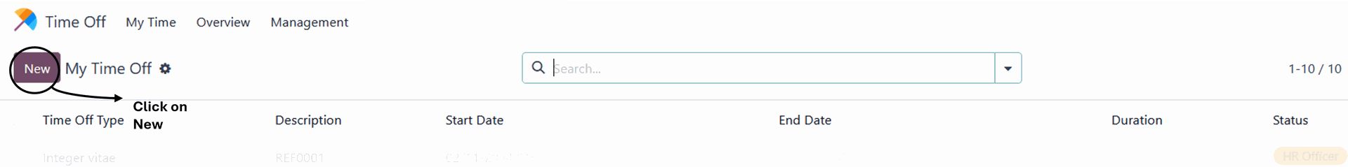In the My Time Off page, you can create a leave request by clicking on "New"