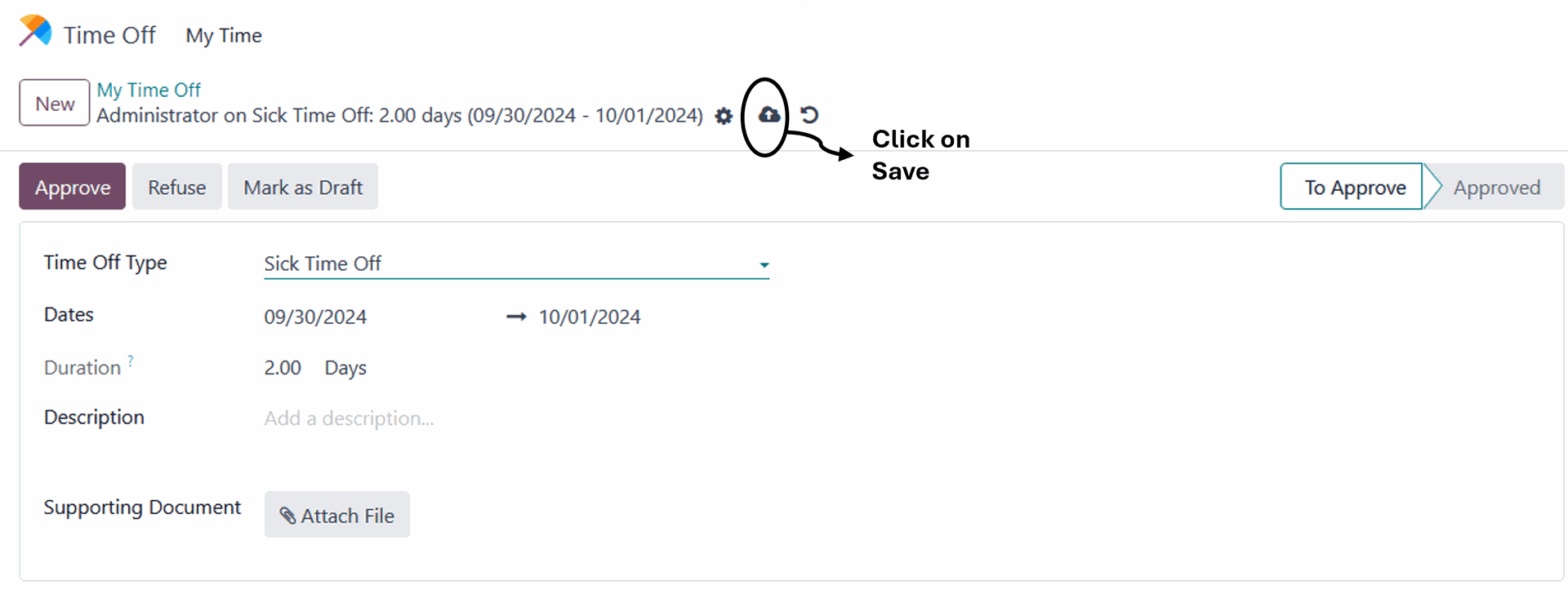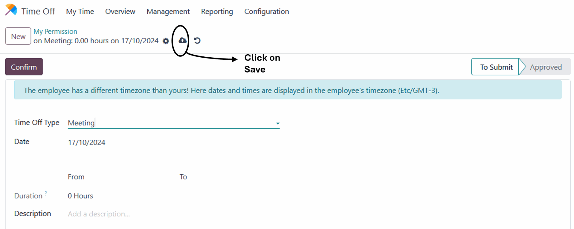 After that, fill in all the required fields, ensuring that the duration is one day in hours. Then click on "Save" to submit the request for approval, as shown below