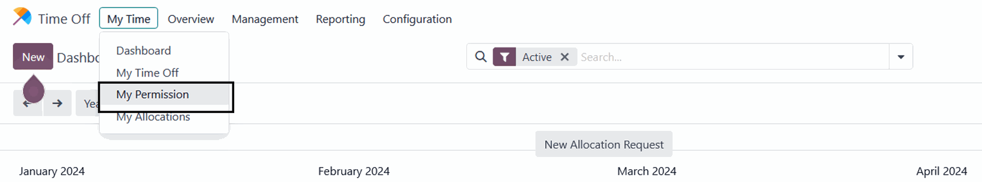 The following page will appear when clicking on My Permission in the My Time menu, as the picture below shown