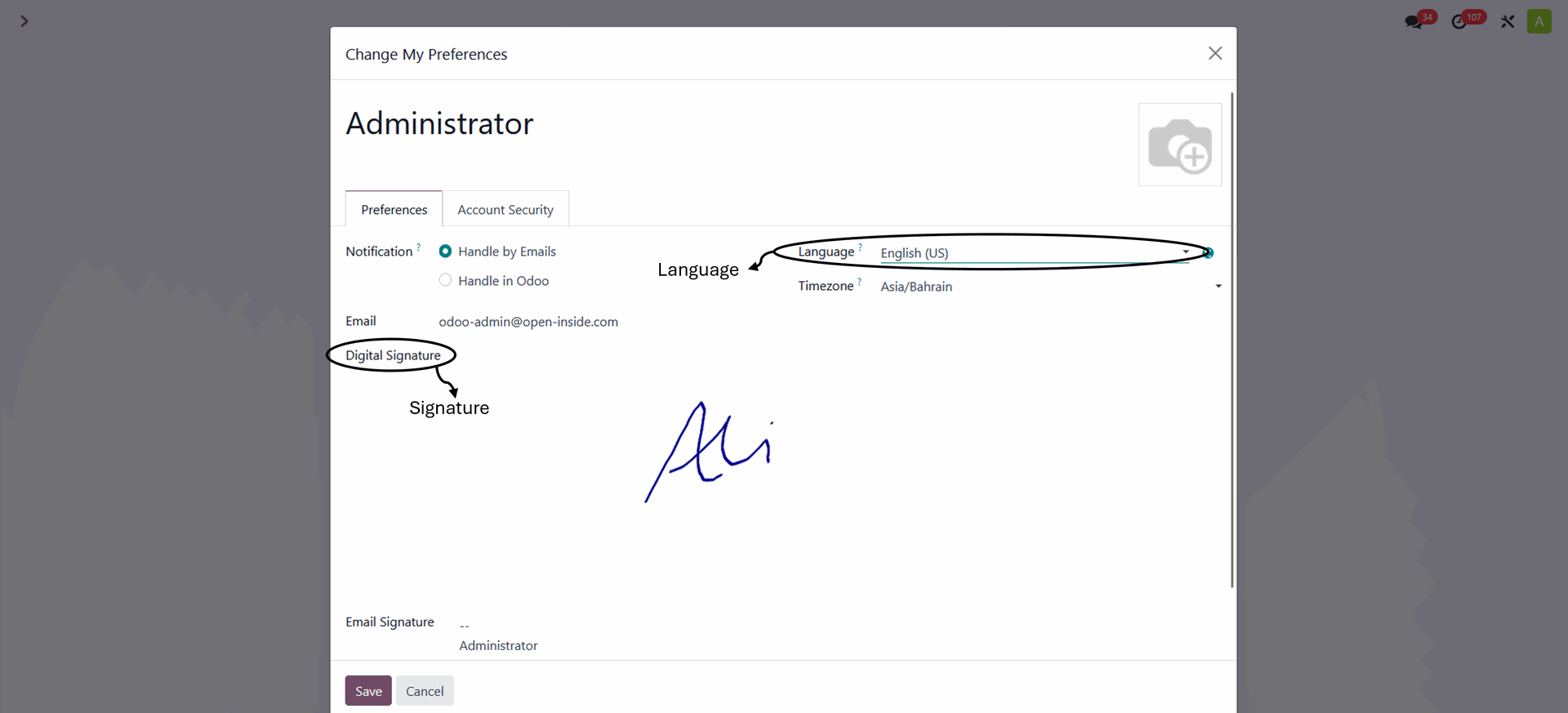 The system enforces default settings for each new user, including language and notification preferences in documents. In the following steps, we will explain how to change the language and password through the user profile settings, accompanied by illustrative images.