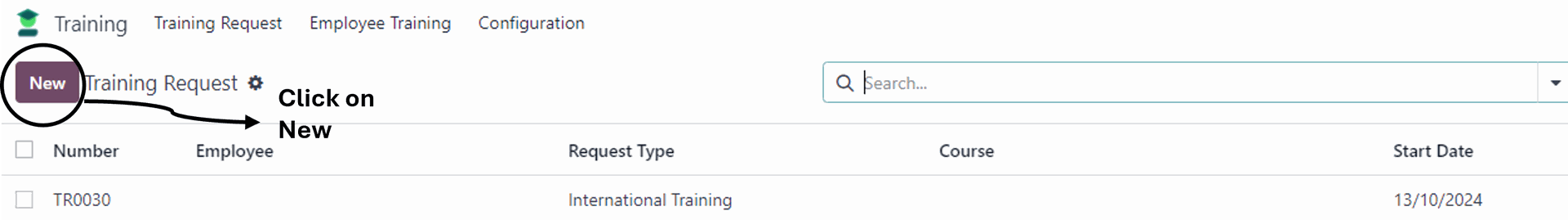 The following screen will appear by clicking on the training module, displaying the training request menu. On the top of the screen, you will see the search tools, and on the top left, the New button so allow the employee to create a new expenses request