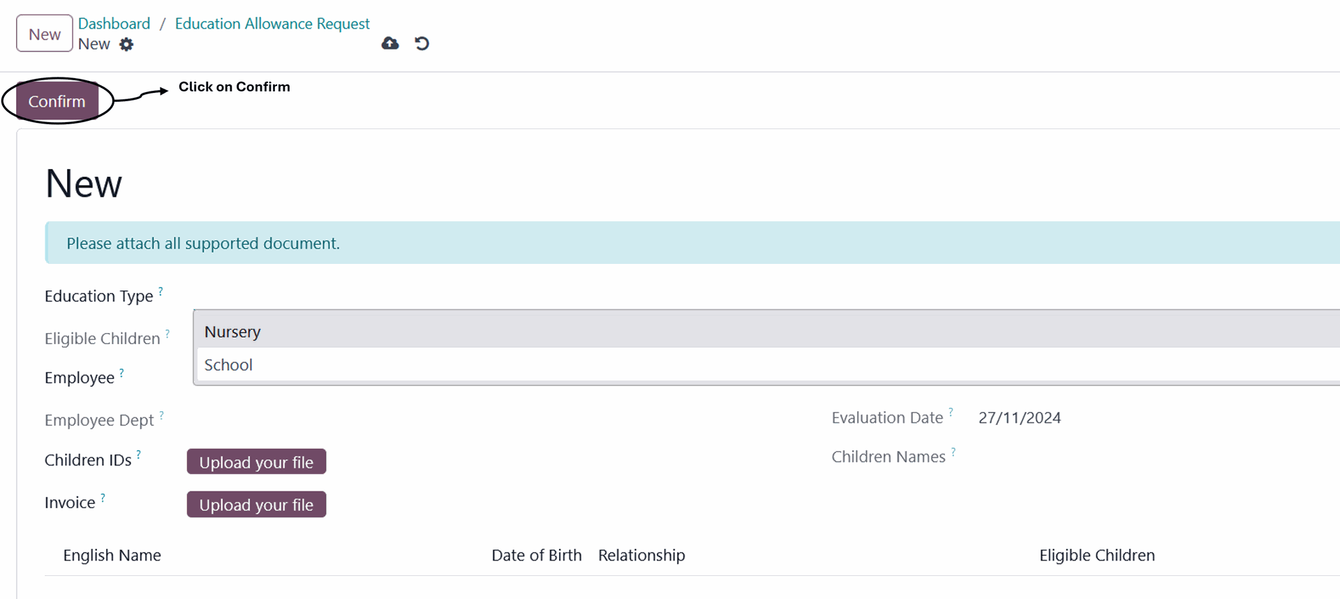Upon accessing the request page, the children of the employee will be displayed automatically once the Education type is selected. The employee must complete the other mandatory fields, such as "Education Type, Children ID, Invoice," and then proceed by clicking on Submit