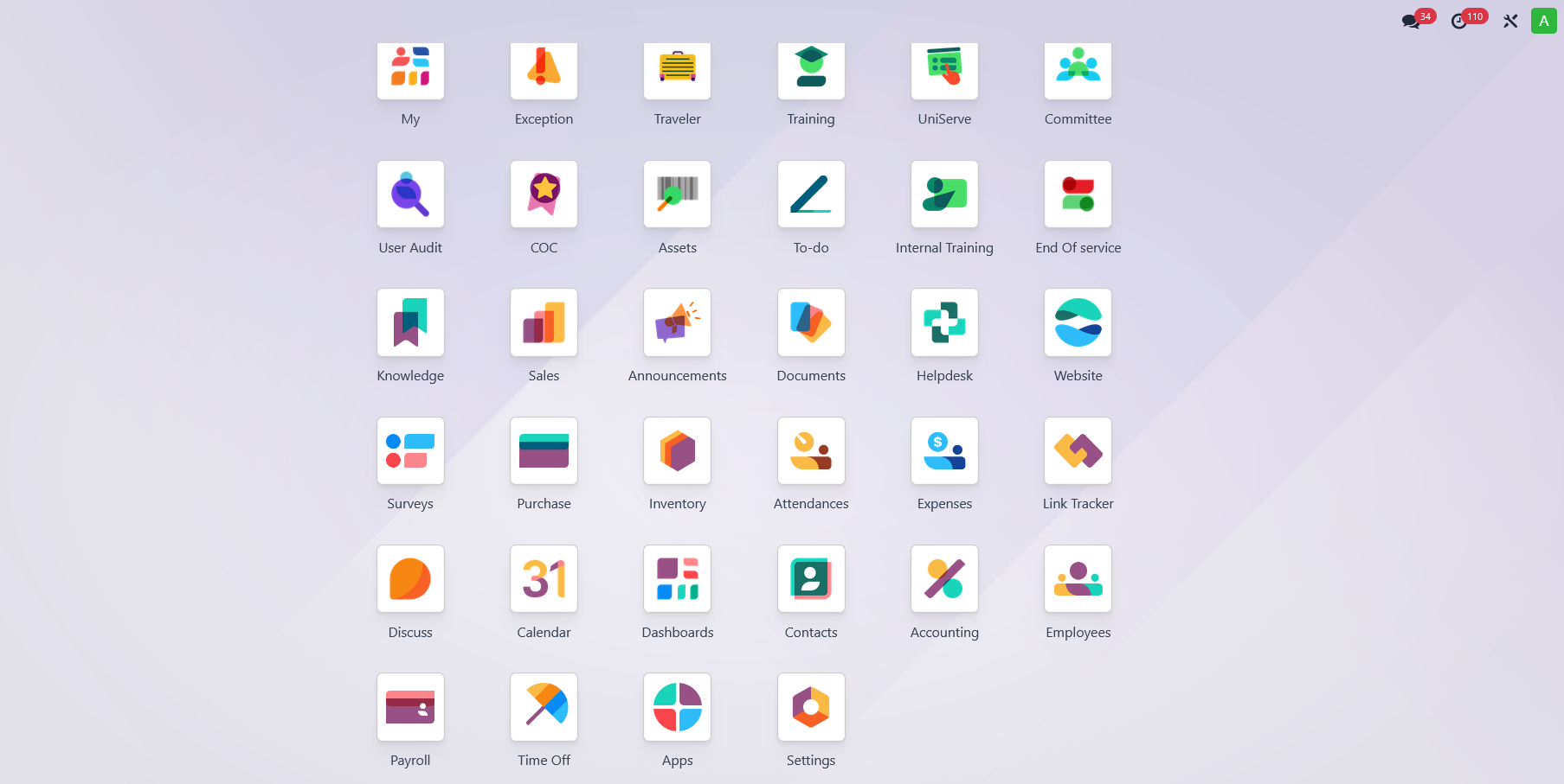 Each user will be able to see the available modules according to their permissions on the main menu screen. Additionally, there is a top-side menu that changes direction based on the language and contains shortcut icons for chats, notifications, activities, and user profile settings.