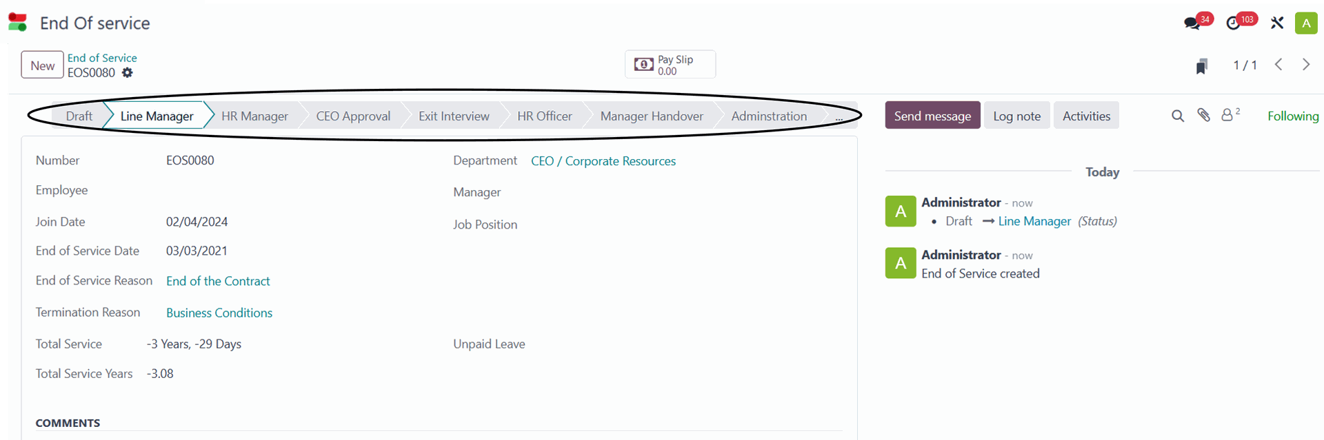 The end-of-service request will be sent to the relevant departments for their approval. Upon final approval, the official procedures for terminating the employee's end of service will be carried out