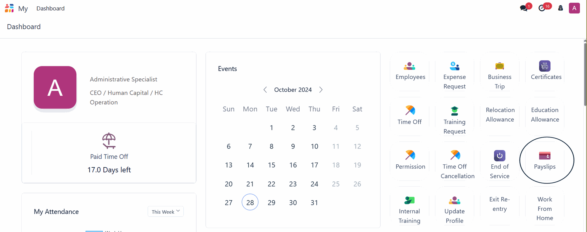 After logging in, users will see the employee self-service features and the icons for the available modules according to their permissions on the main screen. Additionally, users can access more modules that align with their permissions by clicking the icon in the top left corner, as shown in the picture below.