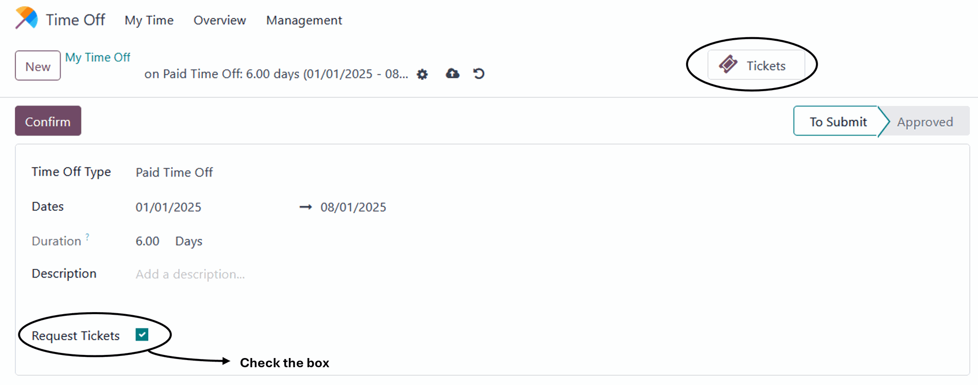 As shown in the image below, only non-Saudi employees can select the option to request tickets after selecting the dates, then click on "Tickets" at the top of the screen. Additionally, requests can only be submitted for Paid Time Off type