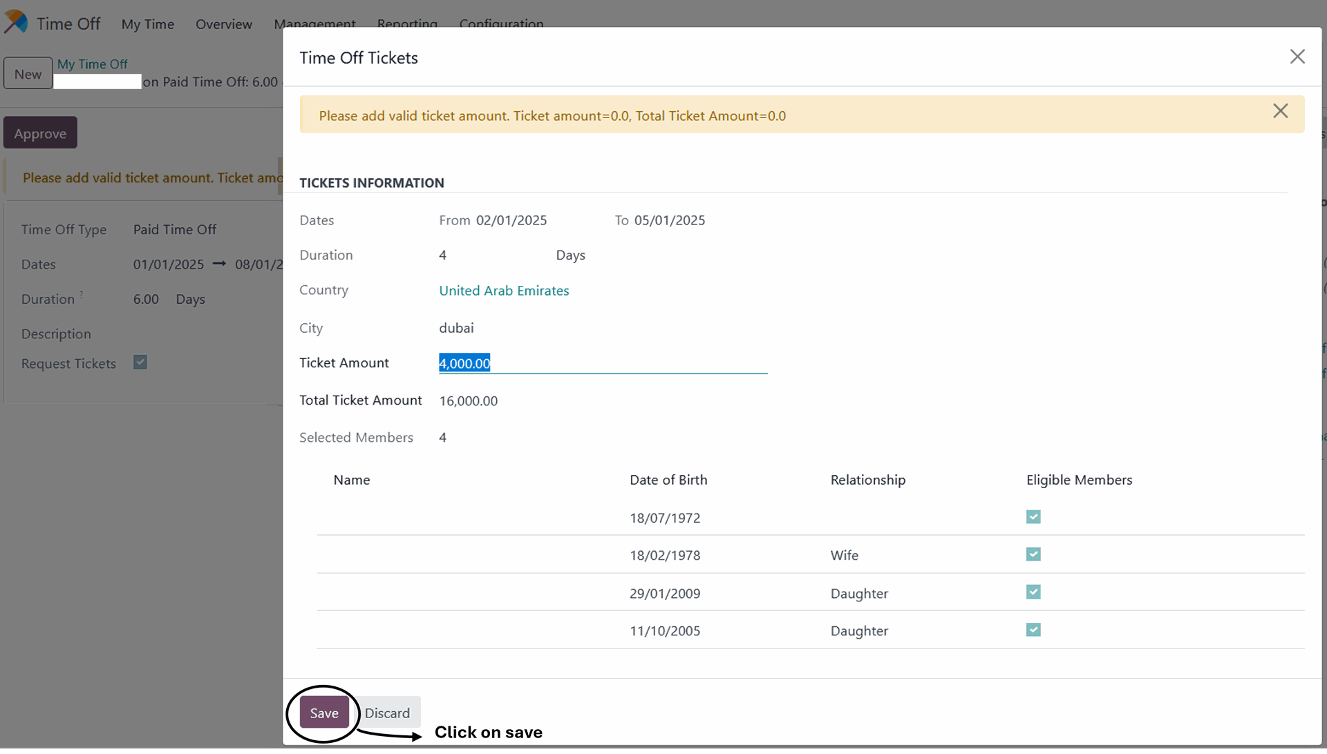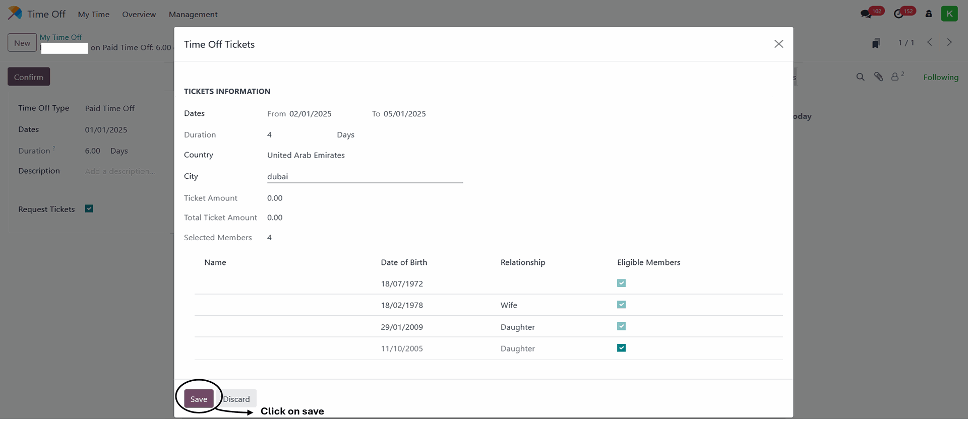 "When you click on the 'Tickets' button, the Time Off Tickets window will appear. The employee can fill in all the required fields, including the dates (the selected dates should be within the duration of the time off), country, city, and select the eligible member they want to add. Then, click 'Save’ and  confirm
