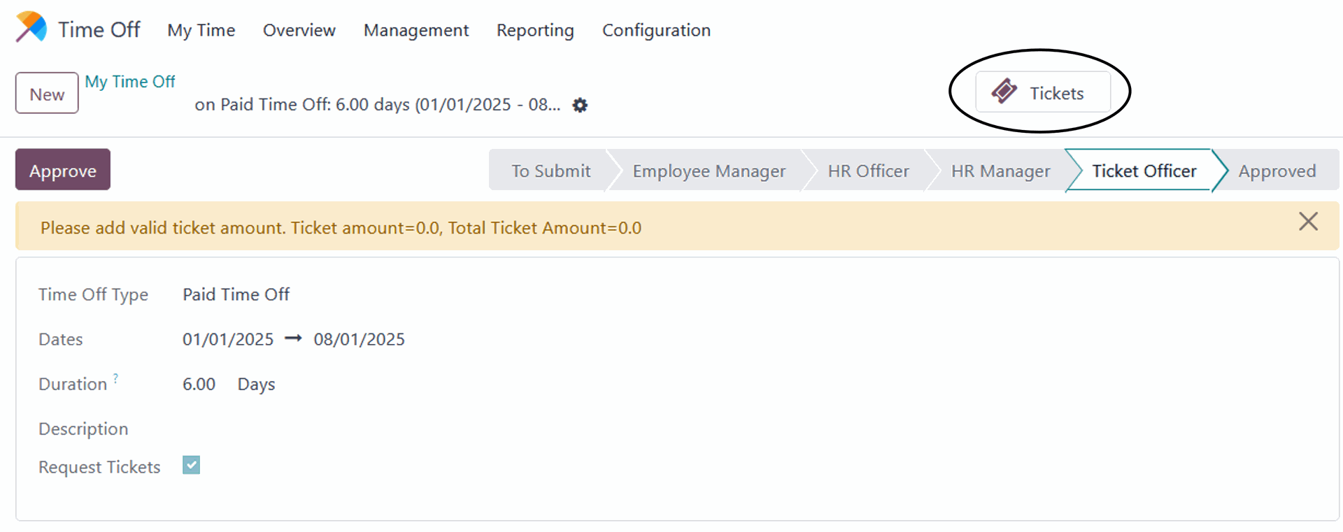 The ticket officer can click on 'Approve' after entering the amount of the tickets for the employee, then the request will approved.